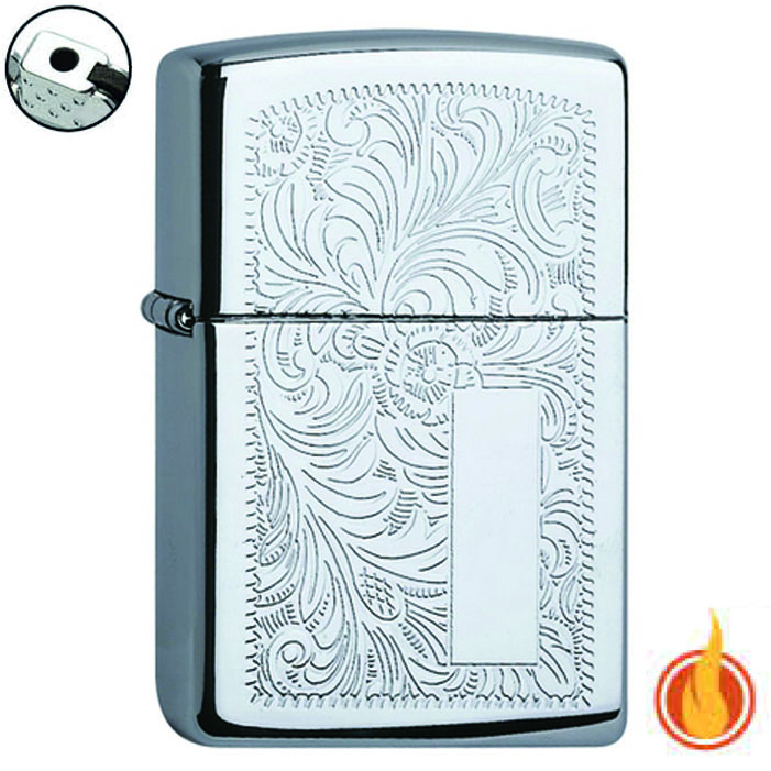 Zippo aansteker regular venetian chroom. Deze Zippo aansteker heeft een hoogglans chromen afwerking en een sierlijke gravure aan de voorzijde en de achterzijde. De zijkanten zijn rondom hoogglans afgewerkt. Een Zippo aansteker is een zeer kwalitatieve aanstekers met de welbekende levenslange garantie, dit betekend dat de Zippo aansteker bij een defect gratis wordt gerepareerd. Deze Zippo is navulbaar met butaangas en heeft een zachte gele vlam. De Zippo heeft een vuursteenontsteking net zoals de traditionele Zippo's.